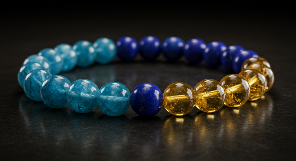 - アパタイトのビーズを中心に、青系(アパタイト自体の青色や、青みがかった他の天然石)と、黄色(例:シトリンなど)や緑(例:アベンチュリンなど)のビーズを組み合わせ、五行のバランスを意識した配色に。