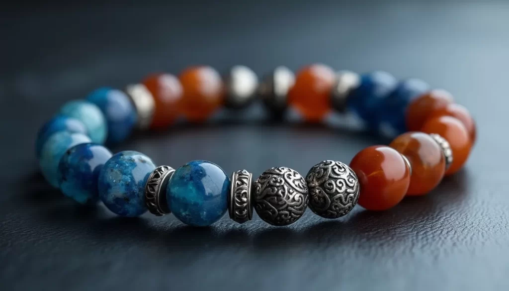 - アパタイトのビーズと、対比としてクールな印象を与えるシルバーや深いブルーのビーズ、さらにアクセントとして暖かみのあるオレンジやレッドのビーズを交互に配置。