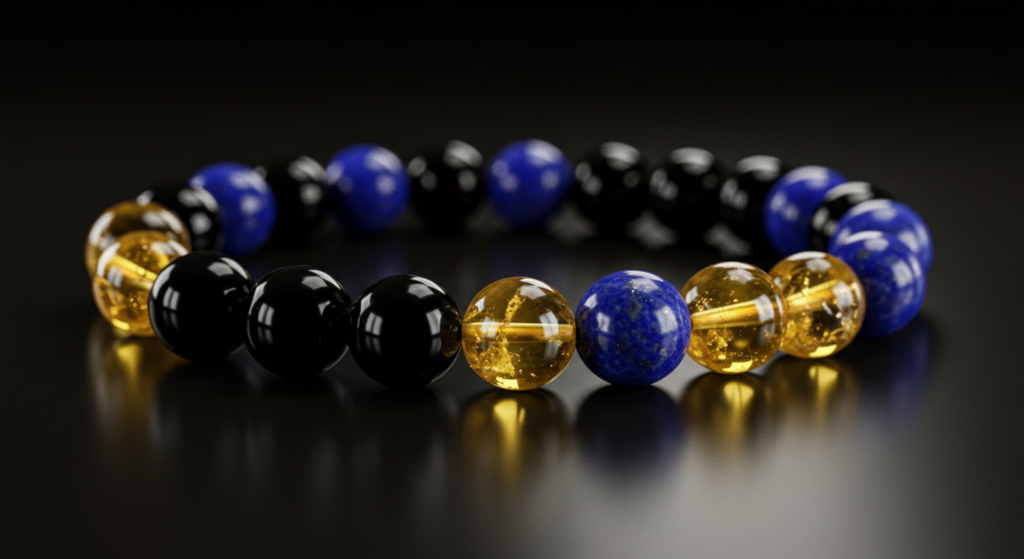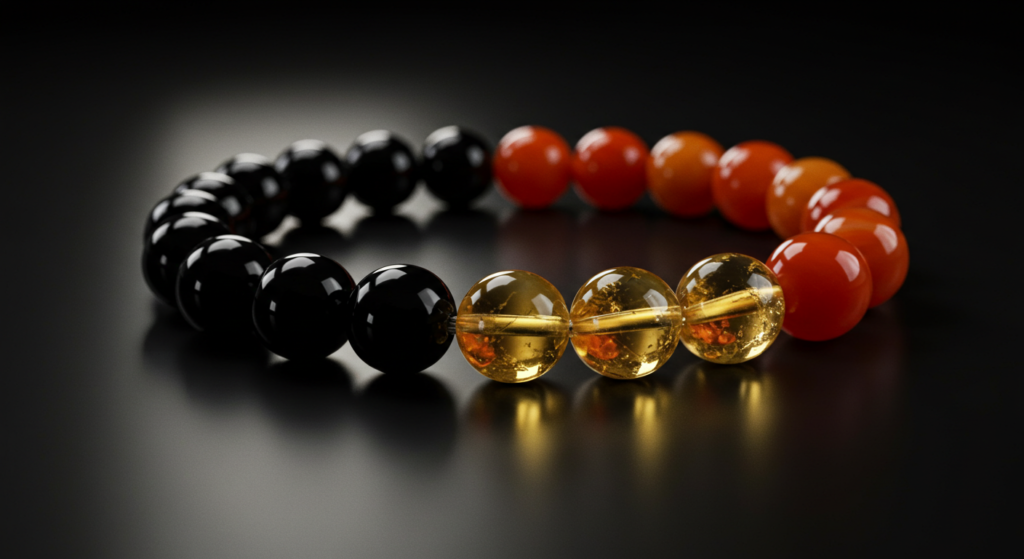 - 構成: ブラックオニキスを中心に、赤(火のエネルギー:例 ルビーまたはカーネリアン)と黄色(土のエネルギー:例 シトリンや黄色トルマリン)のビーズを交互に配置。